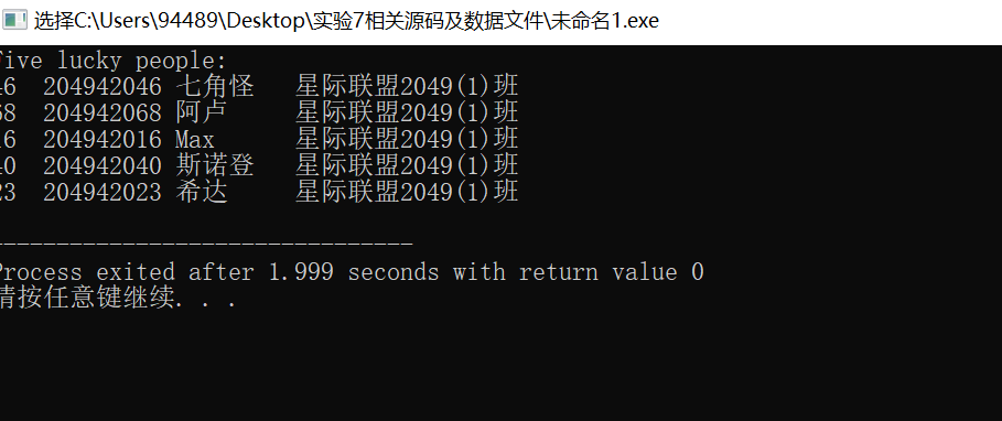 #include<stdio.h> #include<time.h> #include<stdlib.h> #include<string.h> #define N 80 typedef struct{ int number; char stu_number[10]; char name[10]; char class_name[20]; int flag;} STU; int main(){ FILE *fin,*fout; int i,j; STU list[N]; fin=fopen("list.txt","r"); if(!fin){ printf("Failed to open file"); exit(0); } for(i=0;i<N;i++){ fscanf(fin,"%d %s %s %s", &list[i].number, list[i].stu_number, list[i].name, list[i].class_name); list[i].flag=0; } fclose(fin); char buff[20]; struct tm *t; time_t tt; time(&tt); t=localtime(&tt); if (!strftime(buff, sizeof buff, "%Y-%m-%d",t)) puts("strftime failed"); strcat(buff,".txt"); srand(time(NULL)); fout=fopen(buff,"w"); if(!fout){ printf("Failed to open file"); exit(0); } i=0; printf("Five lucky people:\n"); while(i++<5){ j=rand()%N; if(list[j].flag==0){ fprintf(fout,"%02d %10s %-8s %-20s\n",list[j].number, list[j].stu_number, list[j].name, list[j].class_name); printf("%-2d %10s %-8s %-20s\n", list[j].number, list[j].stu_number, list[j].name, list[j].class_name); list[j].flag=1; } else{ i--; continue; } } fclose(fout); return 0; }