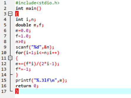 数据表达:用了n,为自变量,i,sign,sum为因变量,n表示前n项,i为for语言中运行数,sign为符号数值sum为所得的和,用了整型数据,也用了双精度浮点型数据