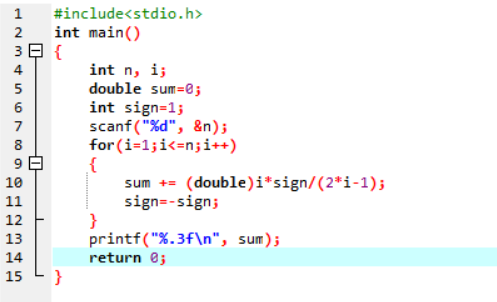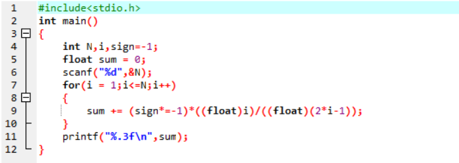 1.1本题要求编写程序,计算交错序列 1-2/3+3/5-4/7+5/9-6/11+... 的前N项之和。