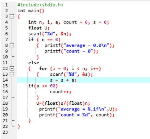 数据表达:设置了n,i,a,count,s整形变量,U单精度浮点型变量,n为输入的学生人数,i为程序中的运算值,count及格人数,s分数和,U平均值