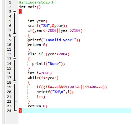 输出21世纪中截止某个年份以来的所有闰年年份。注意:闰年的判别条件是该年年份能被4整除但不能被100整除、或者能被400整除。