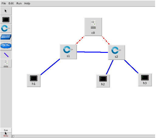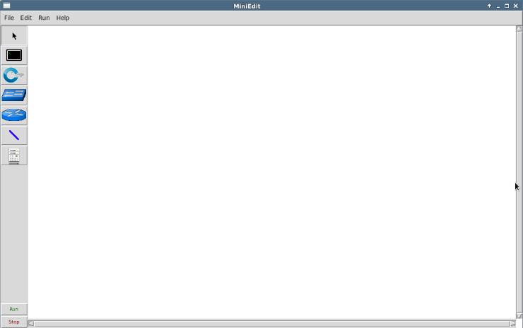 MiniEdit有一个简单的用户界面,在画布的左侧显示一排工具图标,并在窗口顶部显示一个菜单栏。左侧控件依次是Select、Host、Switch、Legancy switch、Legancy router、Netlink、Controller、Run、Stop。