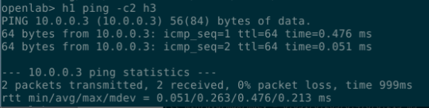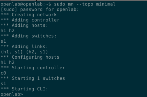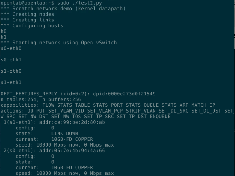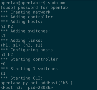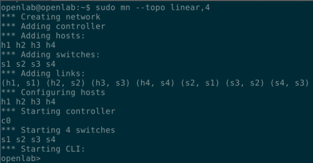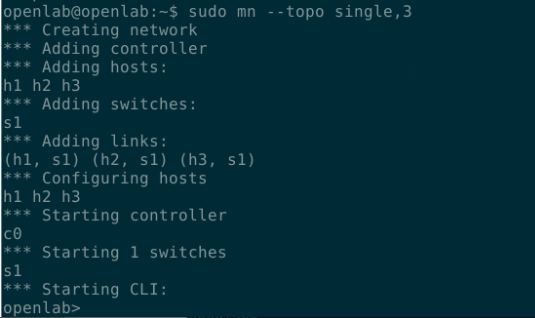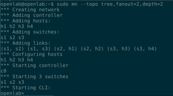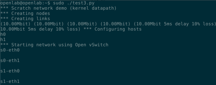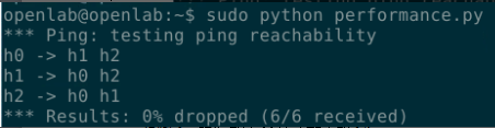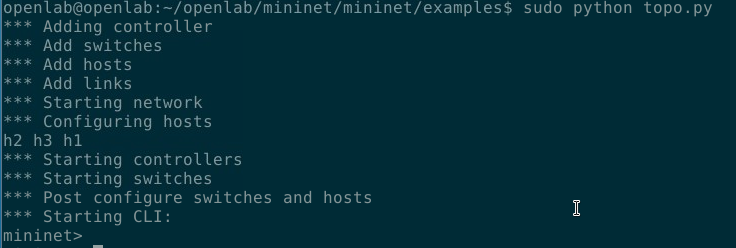 步骤15. 在“/home/openlab/openlab/mininet/mininet/examples”目录下,执行如下命令,运行脚本。