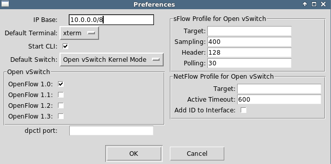 步骤8. 单击菜单栏中的“Edit”,选择“Preferences”,进入Preferences界面,勾选“Start CLI”和OpenFlow协议版本,如下图所示。