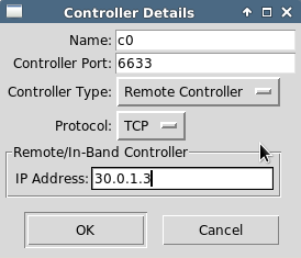 步骤3. 鼠标悬停在控制器上,按住鼠标右键,选择Properties即可设置其属性。设置controller type为“remote controller”,并填写控制器的端口和IP地址,如下图所示。