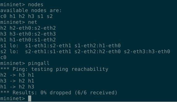 步骤13. 在Mininet CLI中输入Mininet常用命令,查看拓扑中的节点和连接关系,主机之间互Ping测试拓扑连通性,如下图所示。