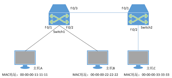 这时,主机A和主机C通信就是一单播的形式传输数据帧了,主机B和主机C通信如上述过程一样,因此交换机2的MAC地址表中记录着主机A和主机B的MAC地址都对应接口f0/1。