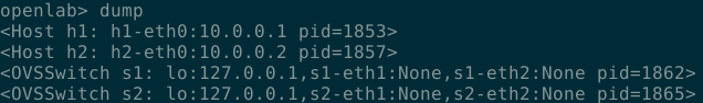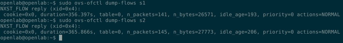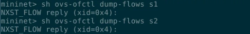 $ sudo ovs-ofctl dump-flows s1 $ sudo ovs-ofctl dump-flows s2![]()