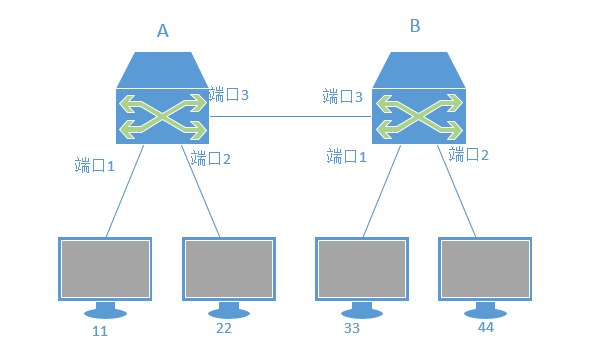 步骤1. 如下图所示,假设交换机A和B的MAC地址表是空的,主机11向主机33发送数据帧。