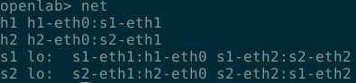 $ sudo ovs-vsctl del-fail-mode s1 $ sudo ovs-vsctl del-fail-mode s2说明:因为交换机s1和交换机s2是两个SDN交换机,在启动Mininet时没有指定任何控制器,交换机中没有流表的存在,无法进行转发操作。主机h1和主机h2无法进行通信。执行上述命令后,s1和s2就是两台普通的二层交换机了。