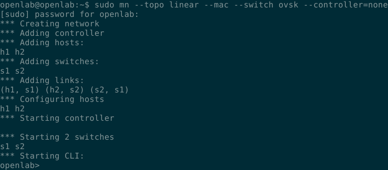 $ sudo mn --topo linear --mac --switch ovsk --controller=none![]()