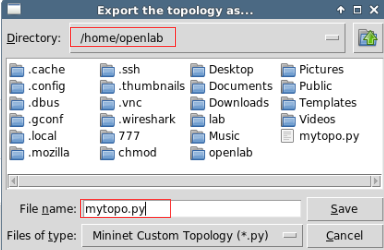 如上图,控制器IP设为30.0.1.3,选择‘ok’。步骤6 选择“File → Export Level 2 Script”,将拓扑保存为Python脚本,位于/home/openlab文件夹下,如下图所示。