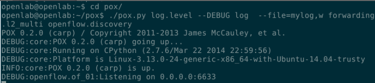 $ cd pox $ ./pox.py log.level --DEBUG log --file=mylog,w forwarding.l2_multi openflow.discovery![]()