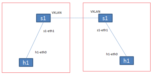 如下图所示,在两台虚拟机中利用Mininet创建两个网络,利用VXLAN连通这两个Mininet环境。关闭默认的控制器后,通过设置流表确保网络的连通性。本实验要求OVS版本在2.0.1以上,实验拓扑如下图所示。