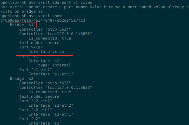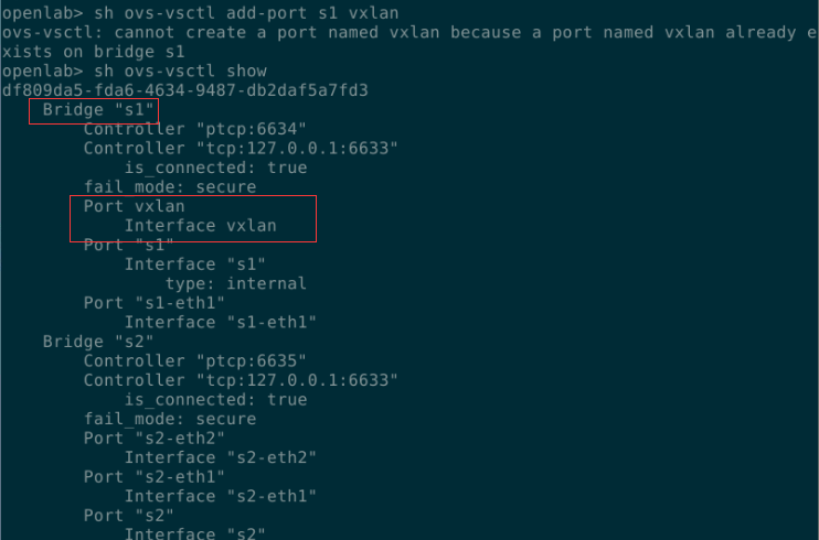 sh ovs-vsctl add-port s1 vxlan sh ovs-vsctl show![]()