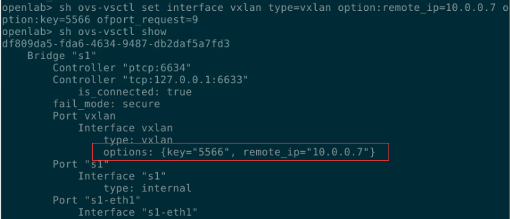 sh ovs-vsctl set interface vxlan type=vxlan option:remote_ip=10.0.0.7 option:key=5566 ofport_request=9 sh ovs-vsctl show![]()