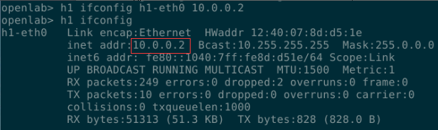 步骤4 执行命令h1 ifconfig h1-eth0 10.0.0.1,为Mininet所创建拓扑中的h1配置IP地址10.0.0.1。