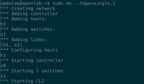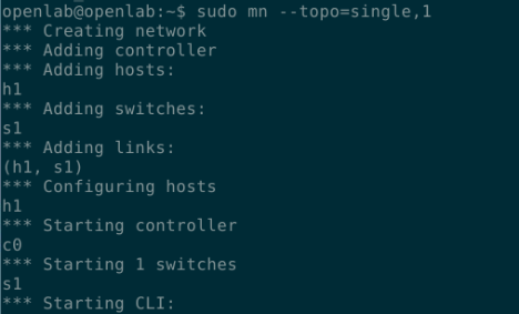步骤1 登录主机host1,执行命令sudo mn --topo=single,1,在host1中创建拓扑(一台交换机连接一台主机)。