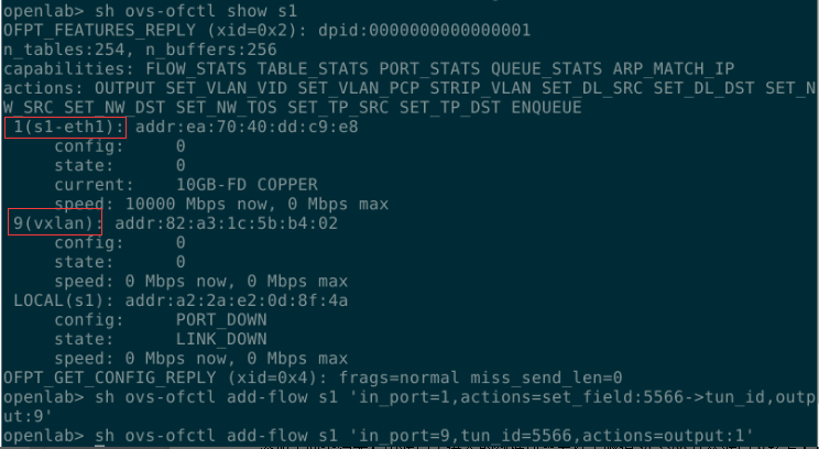 > sh ovs-ofctl show s1 > sh ovs-ofctl add-flow s1 'in_port=1,actions=set_field:5566->tun_id,output:9' > sh ovs-ofctl add-flow s1 'in_port=9,tun_id=5566,actions=output:1' > sh ovs-ofctl show s1![]()