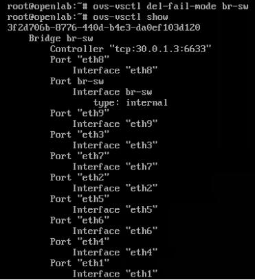 步骤5 登录交换机,用命令ovs-vsctl del-fail-mode br-sw,修改OVS交换机为传统模式。修改后如下所示。