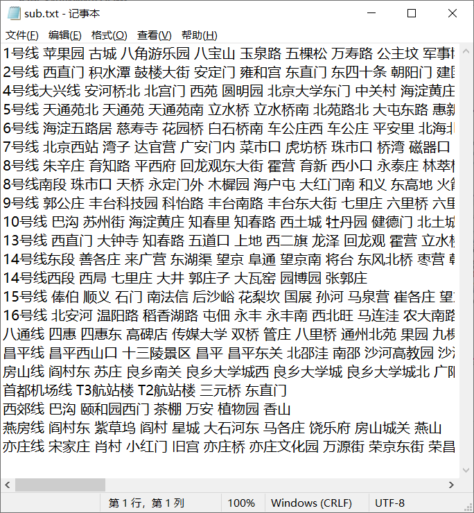List<Station> linkedStaions = new ArrayList<Station>(); for (List<Station> line : DistanceBuilder.lineSet) { //遍历所有地铁线 for (int i = 0; i < line.size(); i++) { if (station.equals(line.get(i))) { if (i == 0) { linkedStaions.add(line.get(i + 1));//地铁站为换乘线的初始站,则继续+1遍历 } else if (i == (line.size() - 1)) { linkedStaions.add(line.get(i - 1));//地铁站为换乘线的终点站,则继续-1遍历 } else { linkedStaions.add(line.get(i + 1)); linkedStaions.add(line.get(i - 1)); } } } } return linkedStaions; }3、主函数与站点、结果存储见github