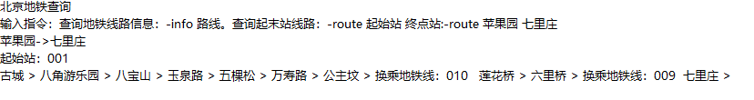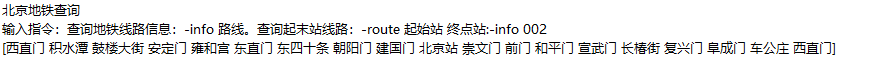 //System.out.print(result.getStar()); String starLine = getLineNameByStation(result.getStar()); String converLine = starLine; System.out.println("起始地铁线:"+starLine); for (Station station : result.getPassStations()) { if(!converLine.equals(station.getLine())){ System.out.print("换乘地铁线:"+station.getLine()+" "); converLine = station.getLine(); converLine = station.getLine(); } System.out.print(station.getName() + " > "); }}运行结果