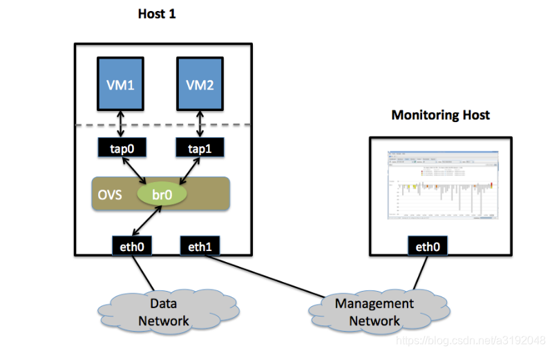 The environment assumes the use of two hosts: host1 and hostMon. host is a hypervisor that run Open vSwitch and has two NICs: