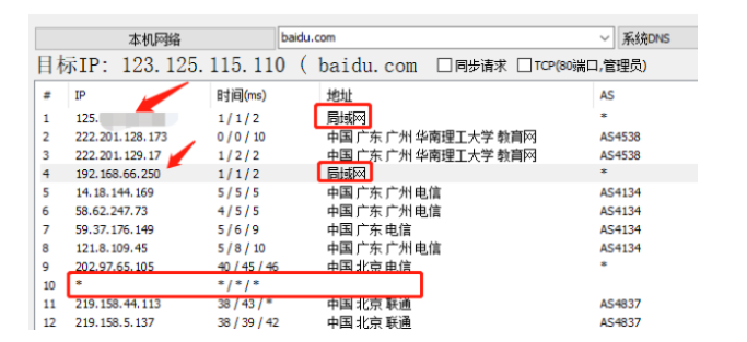 2.第4个记录为什么又多出一个局域网,教育网也是公网ip, 为什么不直接连广州电信,是因为教育网转入公网的原因吗?