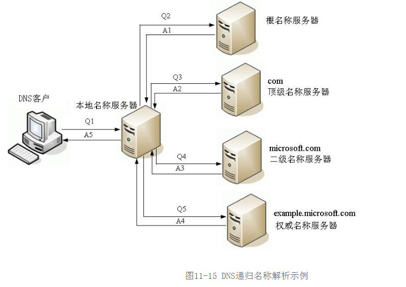 为了方便大家理解,下面举一个实例进行介绍。本示例中假设客户端想要访问自己并不识别的example.microsoft.com站点,并假设此客户端配置的本地名称服务器假设为dns.company.com(通常是以IP地址方式配置的),本地名称服务器上配置的根名称服务器是a.rootserver.net。整个递归名称解析过程如图11-15所示(其中的Q1~Q5表示发送DNS查询请求,A1~A5是DNS查询应答),具体描述如下: