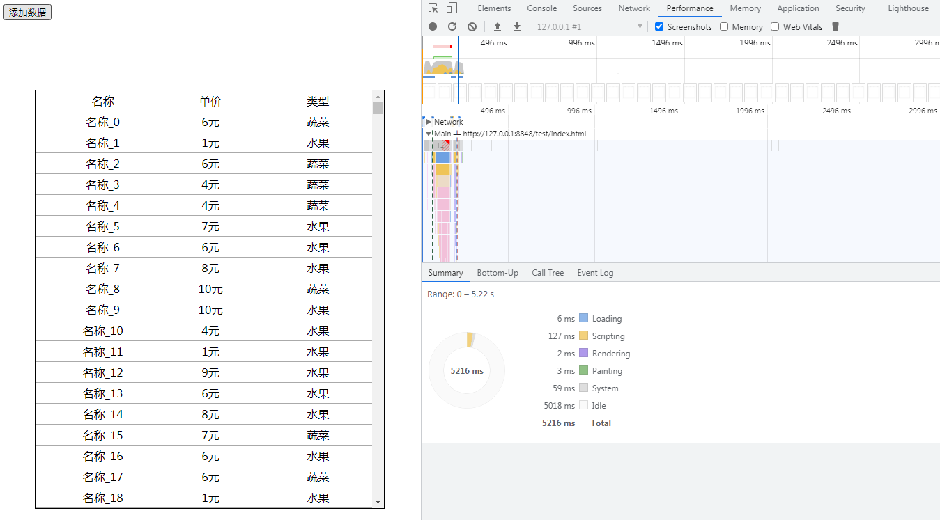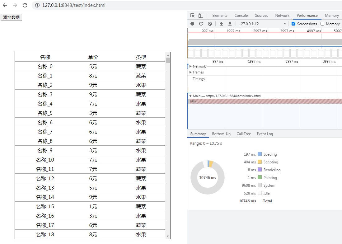 可以看到火焰图中已经有了红色的部分了,dom渲染也耗时也有5s多
