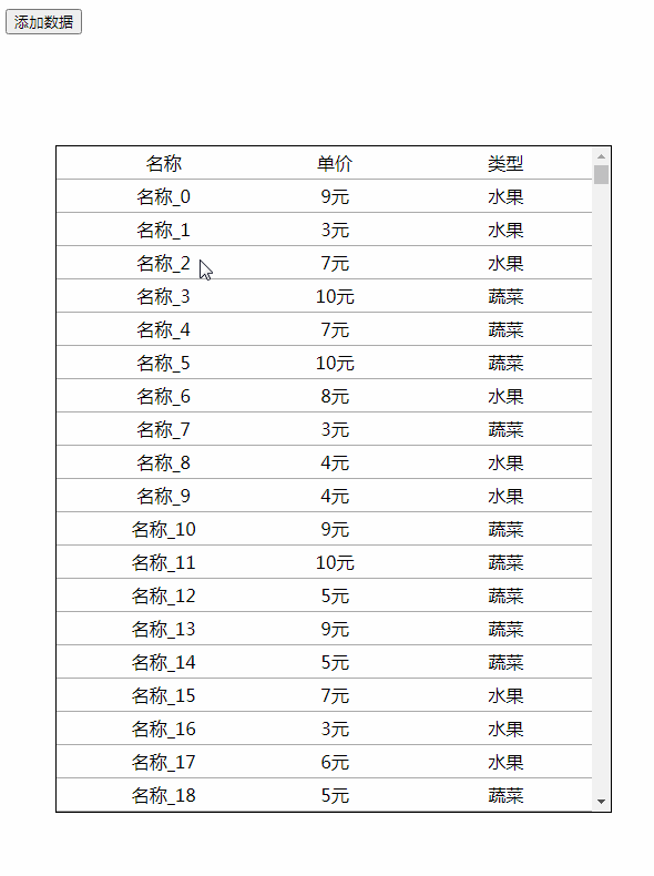 <!doctype html> <html lang="zh"> <head> <meta charset="UTF-8"> <meta name="viewport" content="width=device-width, user-scalable=no, initial-scale=1.0, maximum-scale=1.0, minimum-scale=1.0"> <meta http-equiv="X-UA-Compatible" content="ie=edge"> <title>Document</title> <style> .container { width: 500px; height: 600px; overflow: auto; border: 1px solid; margin: 100px auto; } .item { height: 29px; line-height: 30px; border-bottom: 1px solid #aaa; padding-left: 20px; display: flex; text-align: center; } .item span{ flex: 1; } </style> </head> <body> <div id="app"> <button @click="add">添加数据</button> <div class="container" ref="container"> <div class="scroll-wrapper" :style="style"> <div v-for="(item, index) in scrollList" :key="index" class="item"> <span>{{item.name}}</span> <span>{{item.price}}</span> <span>{{item.category}}</span> </div> </div> </div> </div> <script src="./js/vue.js"></script> <script> new Vue({ el: '#app', data: { list: [ {name:'名称',price:'单价',category:'类型'} ], startIndex: 0, endIndex: 60, paddingTop: 0, paddingBottom: 0, allHeight: 0 }, computed: { scrollList() { return this.list.slice(this.startIndex, this.endIndex) }, style() { return { paddingTop: this.paddingTop + 'px', paddingBottom: this.paddingBottom + 'px' } } }, watch: { list(val) { const valLen = val.length this.allHeight = valLen * 30 this.paddingBottom = this.allHeight - this.scrollList.length * 30 } }, mounted() { const container = this.$refs.container container.addEventListener('scroll', () => { const top = container.scrollTop this.startIndex = Math.floor(top / 30) this.endIndex = this.startIndex + 60 this.paddingTop = top if (this.endIndex >= this.list.length - 1) { this.paddingBottom = 0 return } this.paddingBottom = this.allHeight - 600 - top }) }, methods: { add() { let arr = new Array(100000).fill(0) arr = arr.map((item, index) => { return { name: "名称_" + index, price: Math.ceil(Math.random()*10)+'元', category: Math.random() > 0.5 ? '蔬菜' : '水果' } }) this.list = [ ...this.list, ...arr ] } } }) </script> </body> </html>