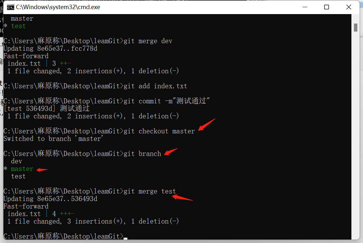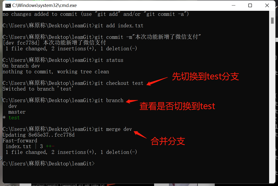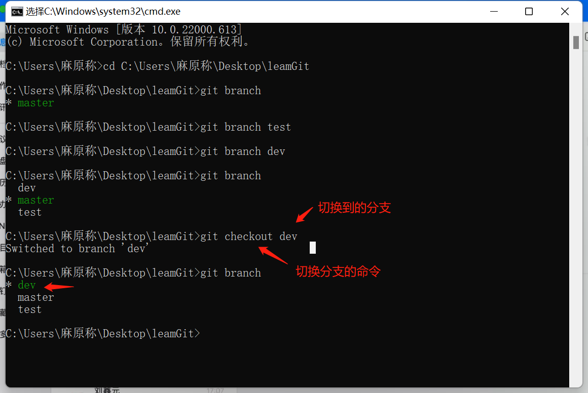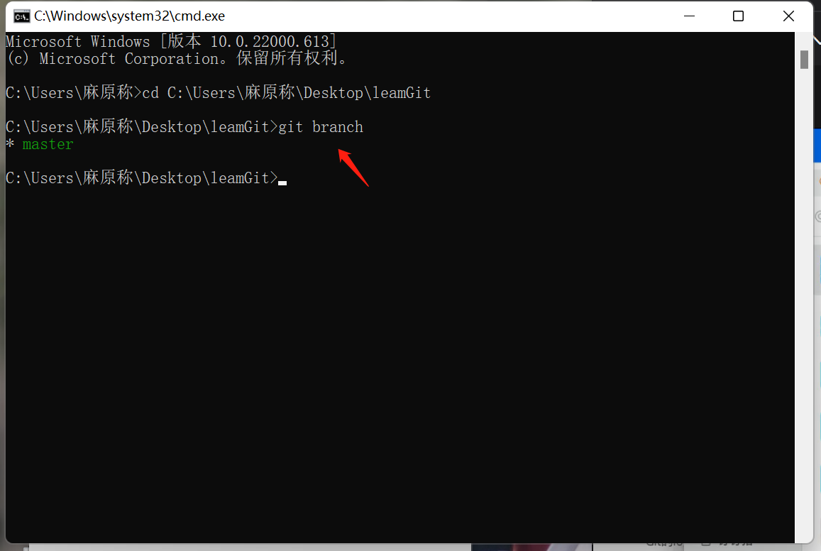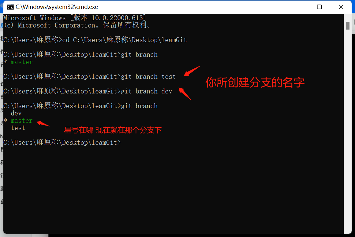 我们在cmd控制面板中输入 git branch + “分支名称” 就可以创建一个新的分支了 如图示: