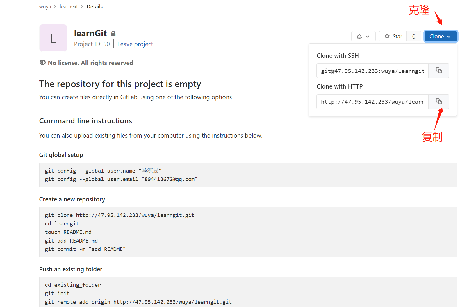 1、我们打开gitlab 登录进去 找到我们要克隆的仓库,在clone 下面找到我们要克隆复制的链接
