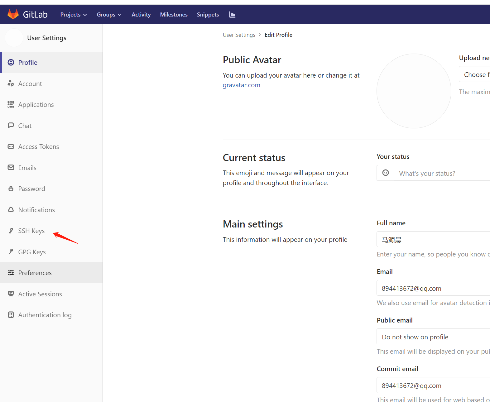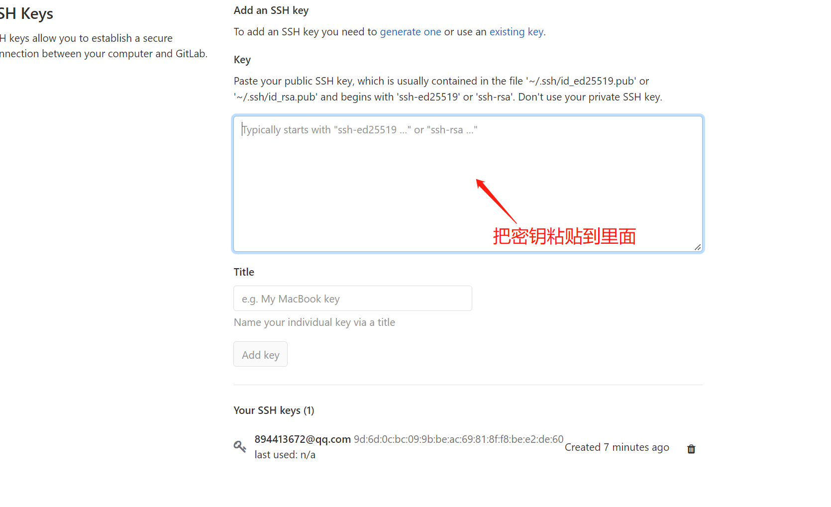 打开Gitlab把密钥配置到GitLab的ssh-key