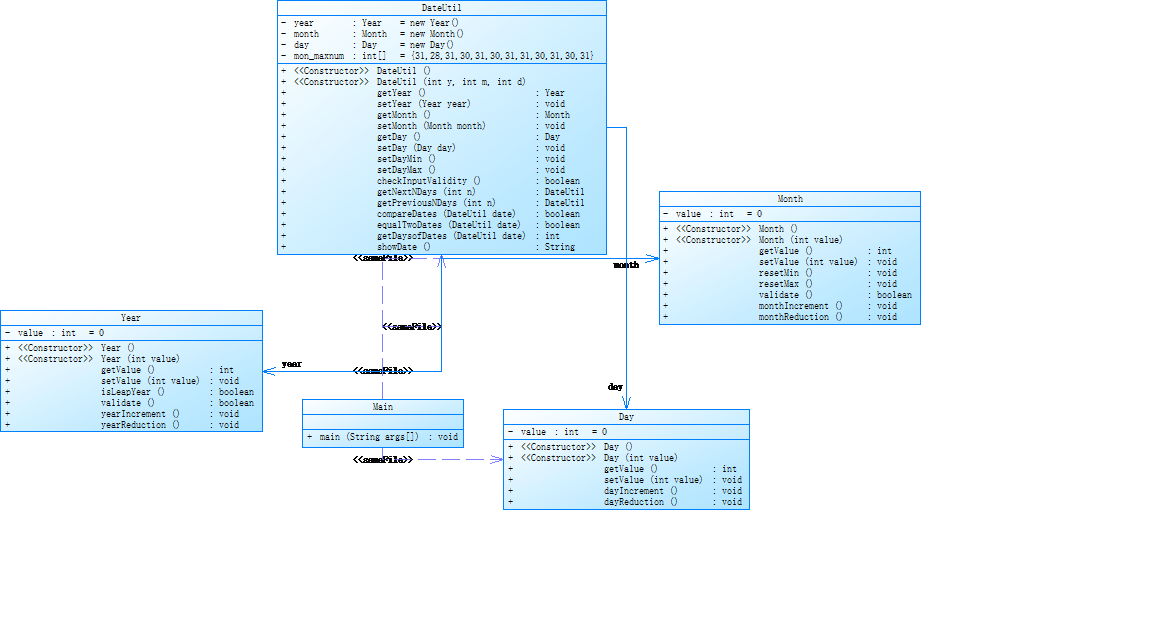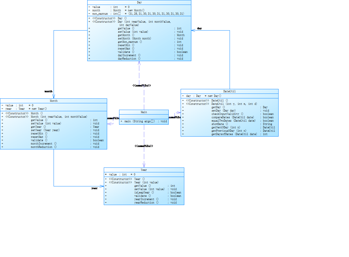 优劣点:从上面两张图可以看出二者的最大圈复杂度的大小,7-2的最大圈复杂度要稍小于7-5的圈复杂度。在7-2和7-5中两道题使用的都是聚合。在7-2中,dateUtil中引用Day类,Day类中又引用Month类,在Month类中引用Year类,这样的缺点是一旦前面的类无法使用后,会导致后面的类也没法使用,而在7-5中Year,Month,Day都放在DateUtil中,则不存在这样的问题,例如即使Day类无法使用,Month,Year类仍然可以照常使用。这样会导致7-2的代码的耦合性高于7-5,并且我们写代码的原则就是耦合性越低越好。二者都还有一个共同的缺点就是运行的时间过长,会导致运行超时。在7-5时体现的更加明显,当使用for循环处理天数增加或减少问题的时候,如果碰到了int型最大值就会运行超时,可以采用将for循环中的int型改成long型,或者改善算法不使用for循环进行操作。比如在计算下n天的时候,可以直接按年份的天数相加,等到最后一年的时候再使用for循环,这样可以大大减少程序运行的时间。