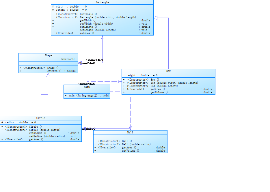最大复杂度度为9,在类中所有的属性均使用了private私有型,在此题中,使用的是让Circle,Ball,Box,Rectangle继承自Shape,Shape是父类,Circle,Ball,Box,Rectangle是子类,其中Shape类还是一个抽象的类,其中有getArea()方法,在子类中分别重写该方法。