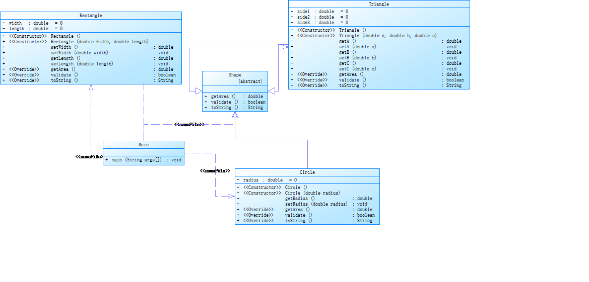 在7-5中,很难得的是圈复杂度终于是0了。在编写代码的过程中,尽量避免了if-else,switch,和循环的分支,所以将圈复杂度给降低下来了。该题将类中的属性都使用的是private型,这样就保证了各个类属性的封装性。设计了一个抽象的Shape类,Circle,Rectangle,Triangle类均是继承自Shape类,其中Shape类中还存在getArea(),validate(),toString()三个抽象方法,三个子类均从父类中继承各个方法,并且在各自的类中对三个方法进行复写,实现代码的多态。