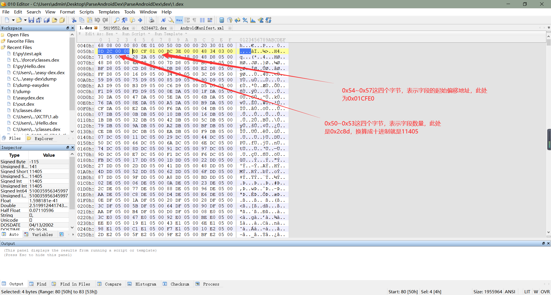 1、在dex文件头中,关于字段(ps:字段可以简单理解成定义的变量或者常量)相关的信息有8个字节,在0x50~0x53这四个字节,按小端序存储这dex文件中的字段数量,在0x54~0x57这四个字节,存储这读取字段的起始偏移地址,如下所示: