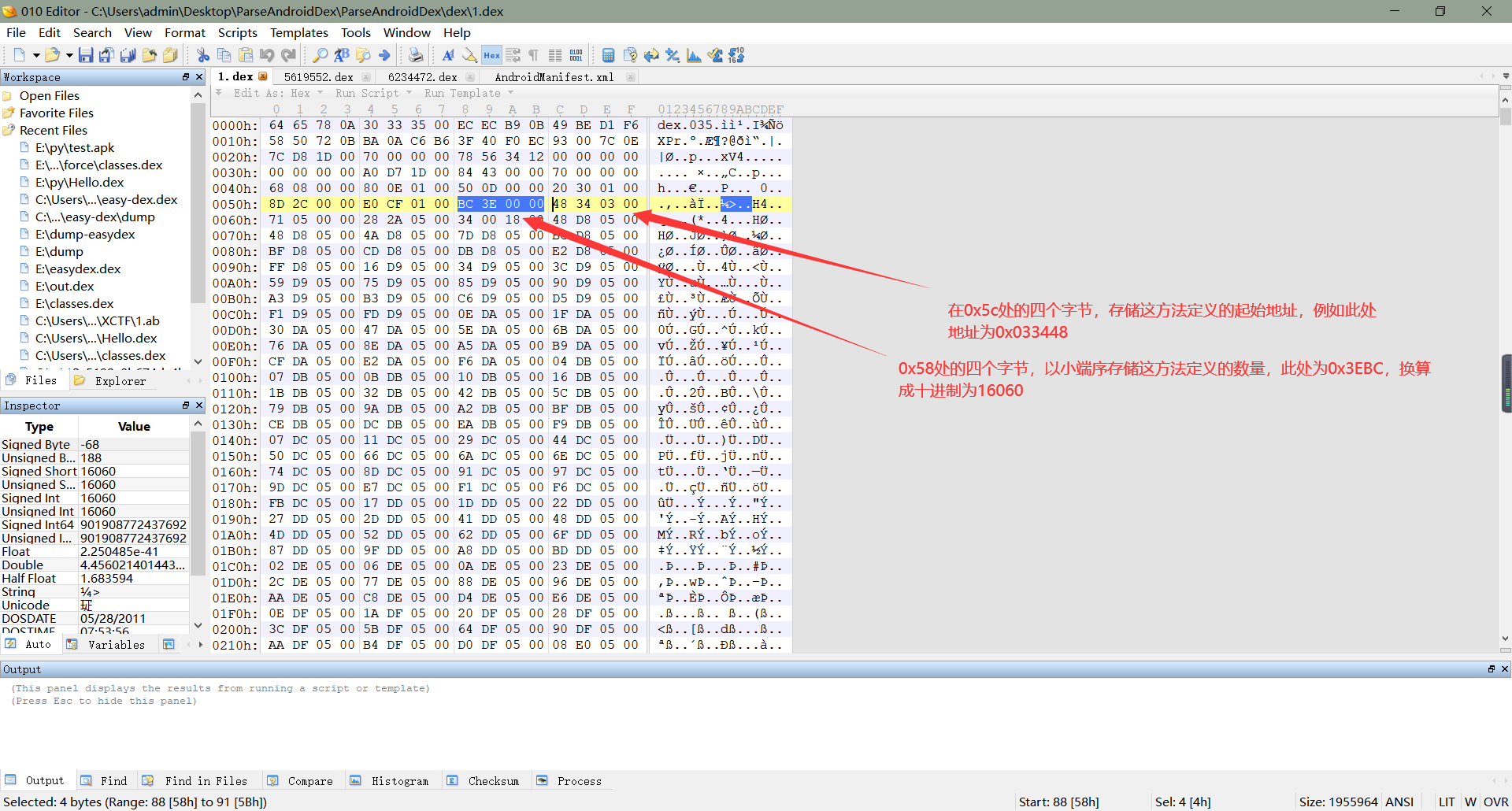 1、在dex文件头中,关于方法定义的信息同样是八个字节,分别位于0x58处和0x5c处。在0x58处的四个字节,指明了dex文件中方法定义的数量,在0x5c处的四个字节,表明了dex文件中的方法定义的起始地址(ps:都是以小端序存储的),如下图所示: