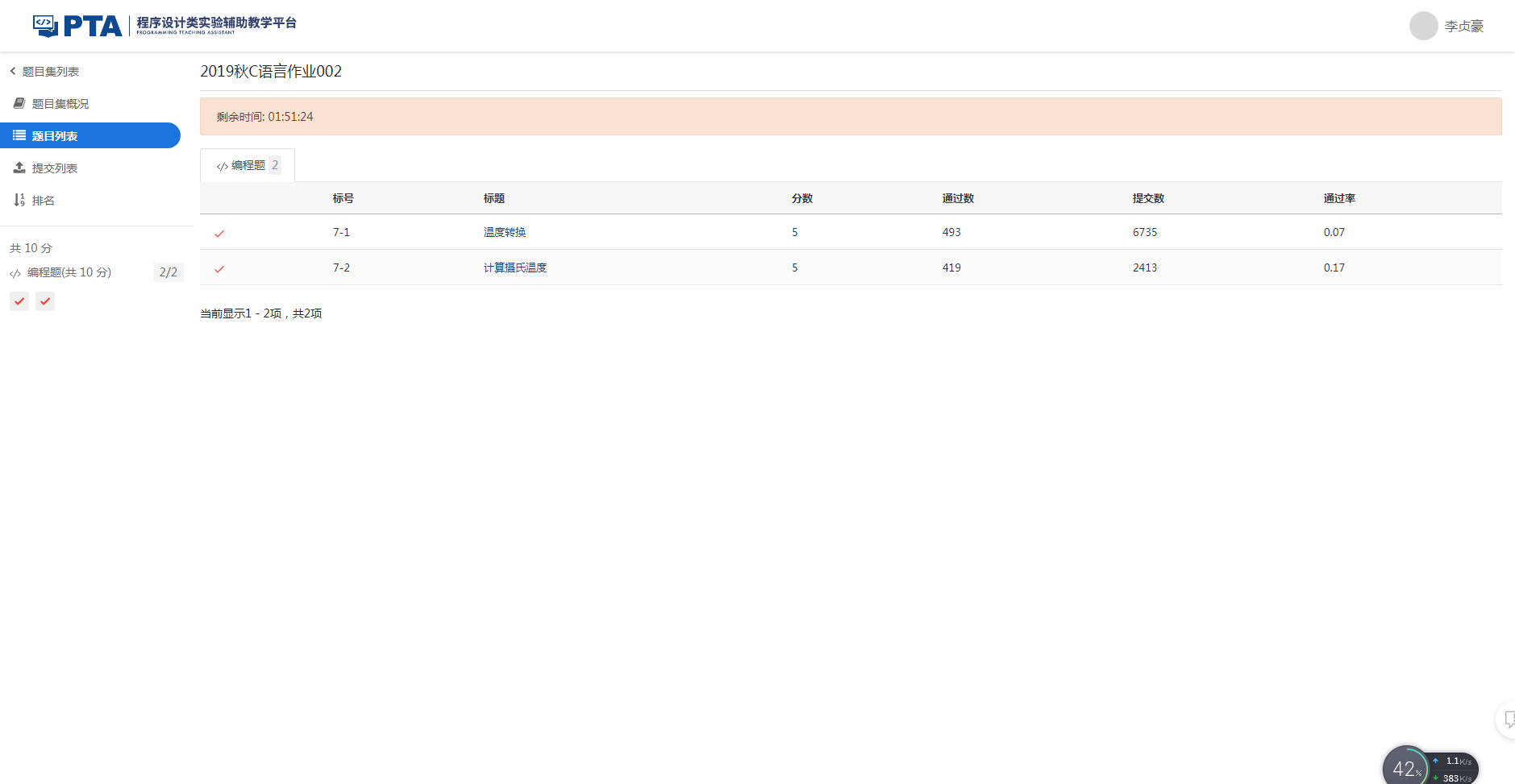 2.2 请完成PTA作业:2019秋C语言作业002。在博客作业中贴出完成图片,图片要求存在自己的名字标识。(2分)