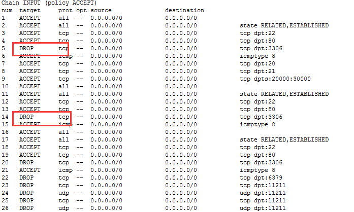 27 ACCEPT tcp -- 0.0.0.0/0 0.0.0.0/0 tcp dpt:3306