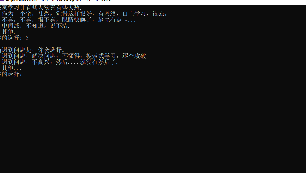 printf("2.不喜,不喜,很不喜,眼睛快瞎了,脑壳有点卡...\n");