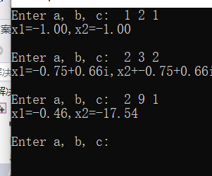 20 printf("x1=%.2f+%.2fi,x2+%.2f+%.2fi\n\n", real, imag, real, imag);
