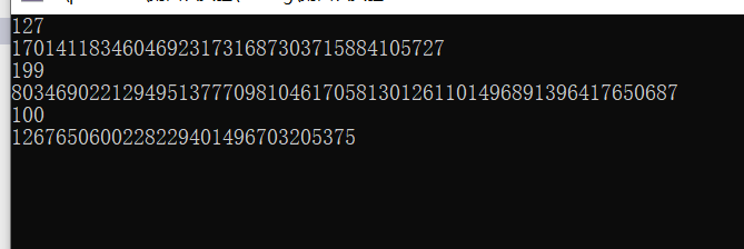 1 #include<stdio.h> 2 void fun02(int n); 3 //大整数运算 4 int main44() { 5 int n; 6 7 while (scanf_s("%d", &n) != EOF) 8 fun02(n); 9 10 return 0; 11 } 12 13 void fun02(int n) { 14 15 int arr[1000] = { 1,0 }, flag = 999; //定义数组来存放每一个位的数(0~9) 16 17 for (int i = n; i > 0; i--) { 18 for (int k = 0; k <= 999; k++) //先算2~n :分开算,*一次2,就对arr每一个元素都乘2, 19 arr[k] *= 2; 20 21 for (int j = 0; j <= 999; j++) { //由于一个数每个位数上是由0~9构成, 22 if (arr[j] > 9) { //且逢十进一,低位求余,高位进一 23 arr[j] %= 10; 24 arr[j + 1]++; 25 } 26 } 27 } 28 29 for (int i = 999; i >= 0; i--) { //把最高位前的0都去掉 30 if (arr[i] == 0)flag--; 31 else break; 32 } 33 34 for (int i = flag; i > 0; i--) //逆序输出,高位在后面 35 printf("%d", arr[i]); 36 37 printf("%d\n", arr[0] - 1); //个位-1 38 }