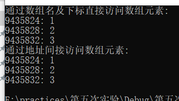 #include <stdio.h> #define N 3 int main() { int a[N] = { 1, 2, 3 }; int i; printf("通过数组名及下标直接访问数组元素:\n"); for (i = 0; i < N; i++) printf("%d: %d\n", &a[i], a[i]); printf("通过地址间接访问数组元素:\n"); for (i = 0; i < N; i++) printf("%d: %d\n", a + i, *(a + i));//是连续存放。。。等价的。。。 return 0; }