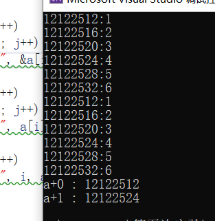 #include<stdio.h> #define LINE 2 #define COL 3 int main() //1 .是按行进行储存的 2 .等价 3. 等价 { int a[LINE][COL] = { 1,2,3,4,5,6 }; int i, j; for (i = 0; i < LINE; i++) for (j = 0; j < COL; j++) printf("%d:%d\n", &a[i][j], a[i][j]); for (i = 0; i < LINE; i++) for (j = 0; j < COL; j++) printf("%d:%d\n", a[i]+j, *(*(a+i)+j)); for (i = 0; i < LINE; i++) printf("a+%d : %d\n", i, a + i); return 0; }