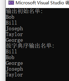 #define _CRT_SECURE_NO_WARNINGS #include <stdio.h> #include<string.h> #define N 5 void selectSort(char str[][20], int n); // 函数声明,形参str是二维数组名 int main0602() { char name[][20] = { "Bob", "Bill", "Joseph", "Taylor", "George" }; int i; printf("输出初始名单:\n"); for (i = 0; i < N; i++) printf("%s\n", name[i]); selectSort(name, N); // 调用选择法对name数组中的字符串排序 printf("按字典序输出名单:\n"); for (i = 0; i < N; i++) printf("%s\n", name[i]); return 0; } // 函数定义 // 函数功能描述:使用选择法对二维数组str中的n个字符串按字典序排序 void selectSort(char str[][20], int n) { int i, j, k; char temp[20] = {0}; for (i = 0; i < n - 1; i++) { k = i; for (j = i + 1; j < n; j++) if (strcmp(*(str + k), *(str + j)) > 0) k = j; if (i != k) { strcpy(temp, str+k); //str[k]+0==str+k,指的是第i行的首地址 strcpy(str[k], str[i]); strcpy(str[i], temp); } } }