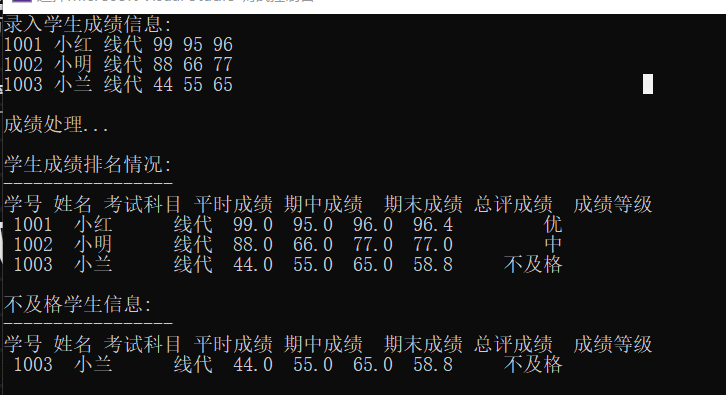 #define _CRT_SECURE_NO_WARNINGS #include<stdio.h> #include<stdlib.h> #include<string.h> #define N 3 typedef struct student { int id; /*学生学号 */ char name[20]; /*学生姓名 */ char subject[20]; /*考试科目 */ float perf; /*平时成绩 */ float mid; /* 期中成绩 */ float final; /* 期末成绩 */ float total; /* 总评成绩 */ char level[10]; /* 成绩等级 */ } STU; void input(STU[], int); /*输入学生信息 */ void calc(STU[], int); /*计算总评和等级 */ int fail(STU[], STU[], int); /*不及格学生统计 */ void sort(STU[], int); /*排序 */ void print(STU[], int); /*输出学生信息*/ int main01() { STU st[N], fst[N]; // 数组st记录学生信息,fst记录不及格学生信息 int k; // 用于记录不及格学生个数 printf("录入学生成绩信息:\n"); input(st, N); printf("\n成绩处理...\n"); calc(st, N); k = fail(st, fst, N); sort(st, N); printf("\n学生成绩排名情况:\n"); print(st, N); printf("\n不及格学生信息:\n"); print(fst, k); return 0; } // 输入学生信息 void input(STU s[], int n) { int i; for (i = 0; i < n; i++) scanf("%d %s %s %f %f %f", &s[i].id, s[i].name, s[i].subject, &s[i].perf, &s[i].mid, &s[i].final); } // 计算总评和等级 void calc(STU s[], int n) { int i; for (i = 0; i < n; i++) { s[i].total = s[i].perf * 0.2 + s[i].mid * 0.2 + s[i].final * 0.6; if (s[i].total >= 90) strcpy(s[i].level, "优"); else if (s[i].total >= 80) strcpy(s[i].level, "良"); else if (s[i].total >= 70 ) strcpy(s[i].level, "中"); else if (s[i].total >= 60 ) strcpy(s[i].level, "及格"); else strcpy(s[i].level, "不及格"); } } int fail(STU s[], STU t[], int n) { int i, k = 0; for (i = 0; i < n; i++) if (s[i].total < 60) t[k++] = s[i]; return k; } void sort(STU s[], int n) { int i, j; STU temp; for (i = 0; i < n - 1; i++) for (j = 0; j < n - 1 - i; j++) if (s[j].total < s[j + 1].total) { temp = s[j]; s[j] = s[j + 1]; s[j + 1] = temp; } } void print(STU s[], int n) { int i; printf("-----------------\n"); printf("学号 姓名 考试科目 平时成绩 期中成绩 期末成绩 总评成绩 成绩等级\n"); for (i = 0; i < n; i++) printf("%5d %5s%10s %5.1f %5.1f %5.1f %5.1f %10s\n", s[i].id, s[i].name, s[i].subject, s[i].perf, s[i].mid, s[i].final, s[i].total, s[i].level); }