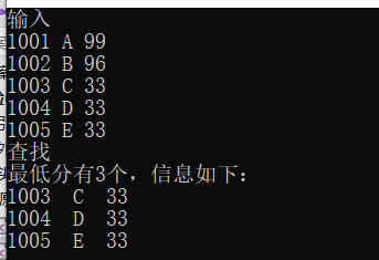 #define _CRT_SECURE_NO_WARNINGS #include<stdio.h> #include<string.h> #define N 5 typedef struct stduent { long num; char name[20]; int score; }STU; void input1(STU [], int ); int search_minst(STU[], STU[], int); void output(STU[], int); int main002() { STU stu[N], minst[N]; int count; printf("输入\n"); input1(stu, N); printf("查找\n"); count = search_minst(stu, minst, N); printf("最低分有%d个,信息如下:\n", count); output(minst, count); return 0; } void input1(STU s[], int n) { int i ; for (i = 0; i < n; i++) scanf("%ld %s %d", &s[i].num, s[i].name, &s[i].score); } void output(STU s[], int n) { int i; for (int i = 0; i < n; i++) printf("%ld %s %d\n", s[i].num, s[i].name, s[i].score); } int search_minst(STU s[], STU min[], int n) { min[0] = s[0]; for (int i = 0; i < n; i++) if (s[i].score < min[0].score)min[0] = s[i]; int a = 1; for (int i = 0; i < n; i++) if (s[i].score == min[0].score && strcmp(s[i].name, min[0].name) != 0) min[a++] = s[i]; return a; }