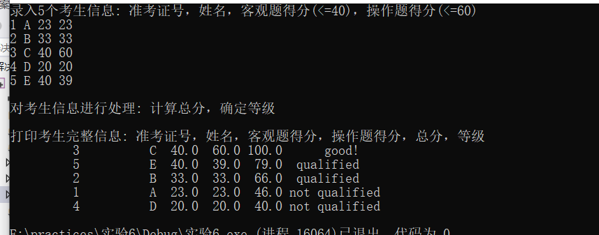 #define _CRT_SECURE_NO_WARNINGS #include <stdio.h> #include <string.h> #define N 5 // 定义结构体类型struct student,并定义其别名为STU typedef struct student { long int id; char name[20]; float objective; /*客观题得分*/ float subjective; /*操作题得分*/ float sum; char level[20]; }STU; // 函数声明 void input2(STU s[], int n); void output2(STU s[], int n); void process(STU s[], int n); int main03() { STU stu[N]; printf("录入%d个考生信息: 准考证号,姓名,客观题得分(<=40),操作题得分(<=60)\n", N); input2(stu, N); printf("\n对考生信息进行处理: 计算总分,确定等级\n"); process(stu, N); printf("\n打印考生完整信息: 准考证号,姓名,客观题得分,操作题得分,总分,等级\n"); output2(stu, N); return 0; } // 录入考生信息:准考证号,姓名,客观题得分,操作题得分 void input2(STU s[], int n) { int i; for (i = 0; i < n; i++) scanf("%ld %s %f %f", &s[i].id, s[i].name, &s[i].objective,&s[i].subjective); } //输出考生完整信息: 准考证号,姓名,客观题得分,操作题得分,总分,等级 void output2(STU s[], int n) { int i; for (i = 0; i < n; i++) printf("%10ld %10s %5.1f %5.1f %5.1f %10s\n", s[i].id, s[i].name, s[i].objective, s[i].subjective, s[i].sum, s[i].level); } // 对考生信息进行处理:计算总分,排序,确定等级 void process(STU s[], int n) { STU temp; int i; for (int i = 0; i < n; i++) s[i].sum = s[i].objective + s[i].subjective; for ( i = 0; i < n-1; i++) for (int j = 0; j < n-1-i; j++) { if (s[j].sum < s[j + 1].sum) { temp = s[j]; s[j] = s[j + 1]; s[j + 1] = temp; } } for ( i = 0; i < n; i++) { if (i < N * 0.1)strcpy(s[i].level, "good!"); else if(i<=N*0.5&&i>0.1*N)strcpy(s[i].level, "qualified"); else strcpy(s[i].level, "not qualified"); } }